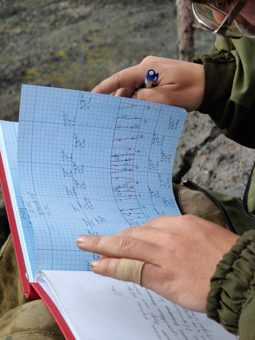 Партия №5 расквиталась с канавами и теперь плотно занимается керном. В объектив фотоаппарата над керновым столом уже попали все рудные зоны месторождения, в лотке побывали все минералогические пробы, отобранные из полотна канав. Цифры оставшегося метража с каждым днем убывают все быстрее, а количество образцов, напротив, возрастает с каждым часом.