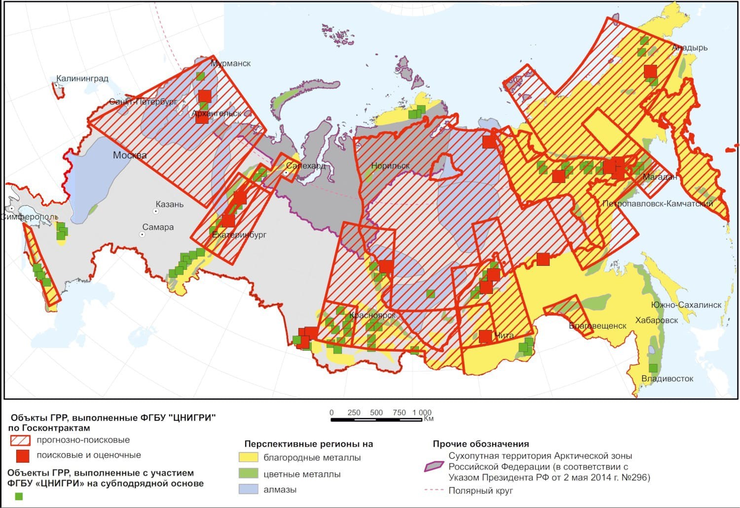 За последние два десятилетия силами ЦНИГРИ, как Генподрядчика, были проведены прогнозно-поисковые, поисковые, оценочные и разведочные работы на более чем 50 объектах. Работы специалистов института, как правило, завершались локализацией новых перспективных площадей для постановки поисковых работ на алмазы, благородные и цветные металлы в Уральской, Алтае-Саянской, Яно-Колымской, Карело-Кольской, Байкало-Витимской и др. провинциях, открытием ряда новых месторождений на АБЦМ. Для уникального месторождения Сухой Лог уточнено геологическое строение, разработана рациональная технологическая схема обогащения руд, выполнен и утвержден в ГКЗ подсчет запасов.