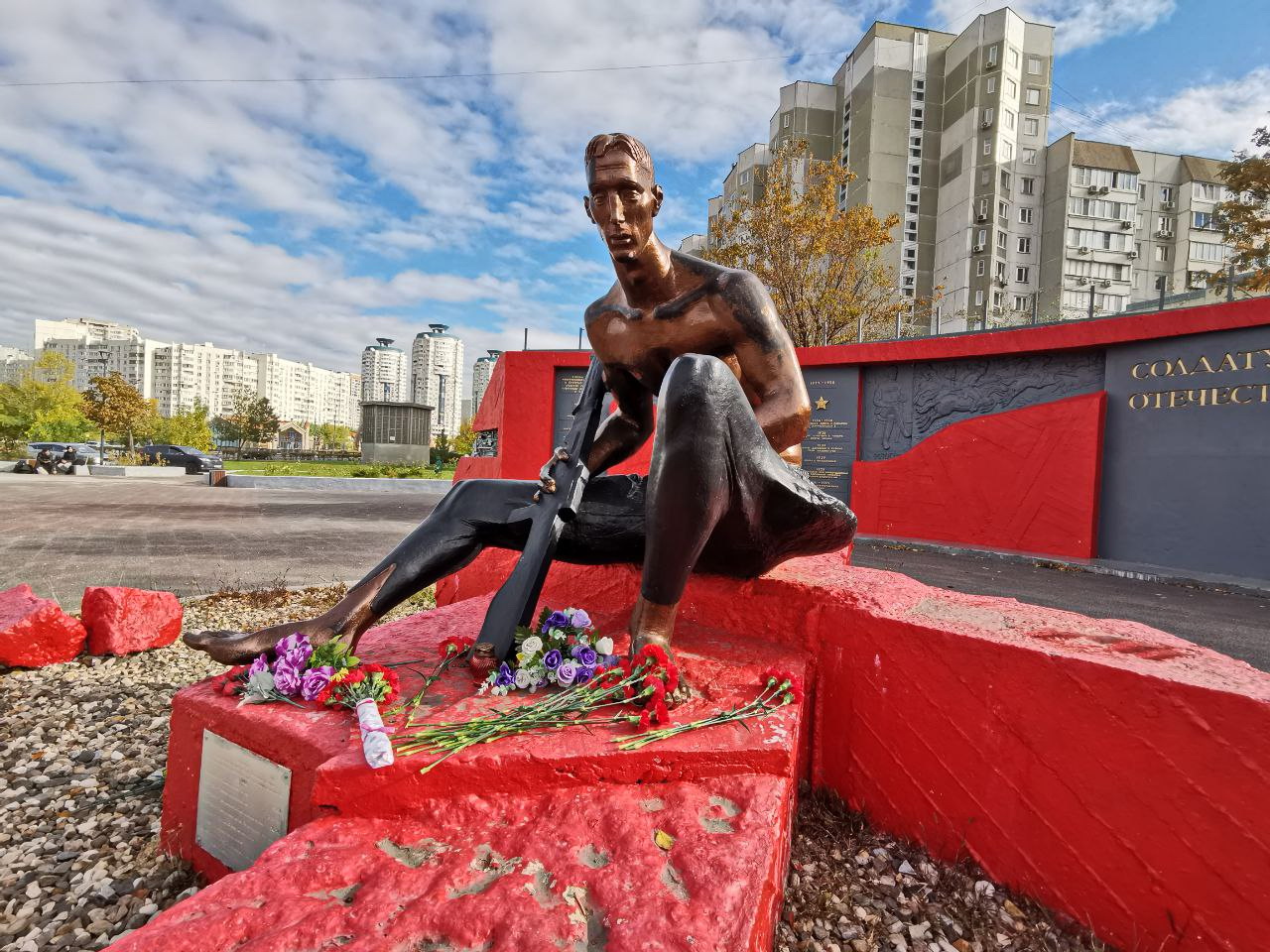 «Солдат Отечества», по замыслу скульптора, олицетворяет конец боя, когда радость победы ещё не наступила, но горечь потери товарищей уже ощущается. Каждая победа отзывается у нас в сердце памятью о павших и живущих, памятью о тех, кто сделал все, чтобы мы сейчас были вместе. #мывместе